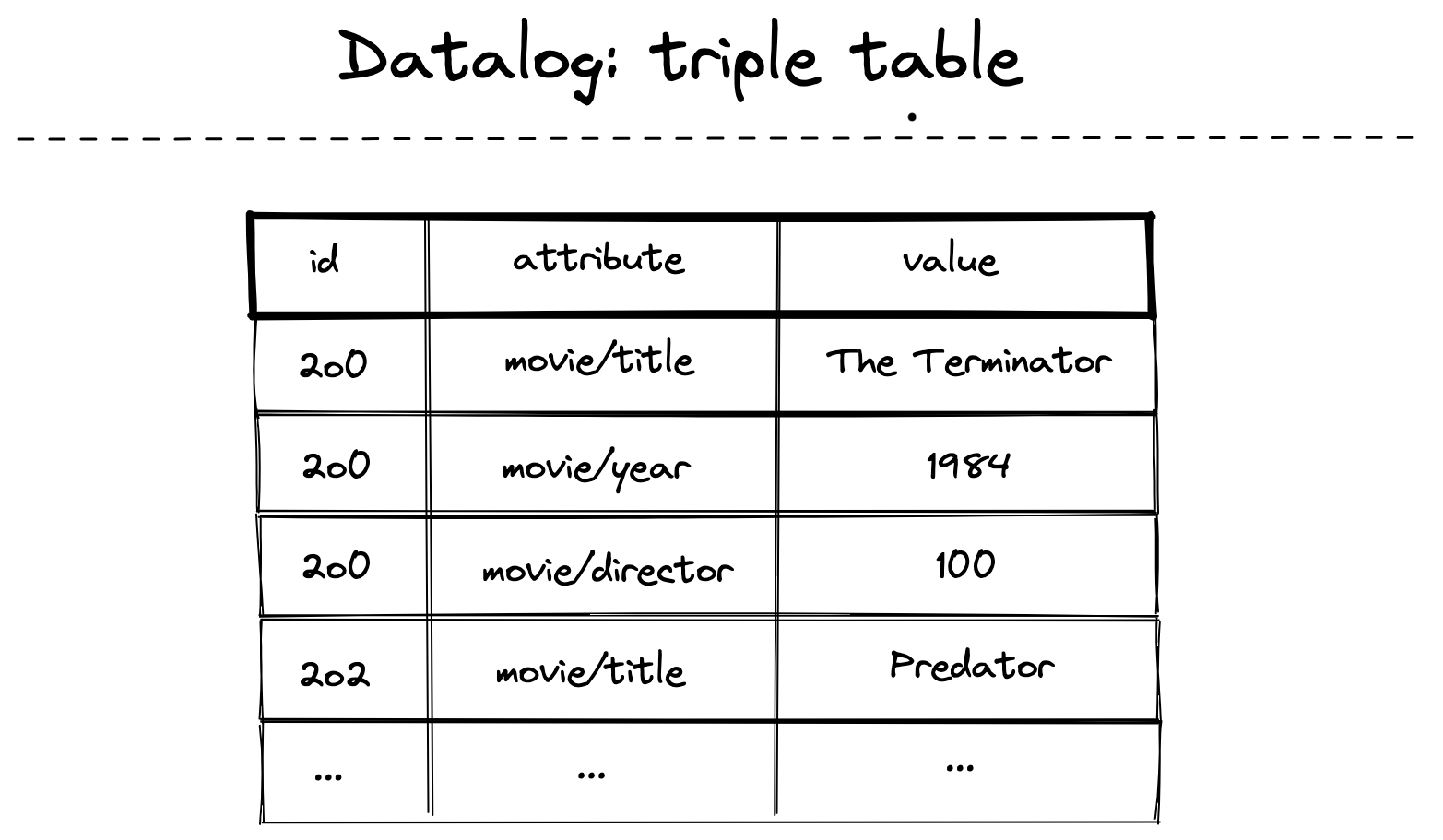 In Datalog databases, there are no tables. Or really everything is just stored in one table, the triple table:
