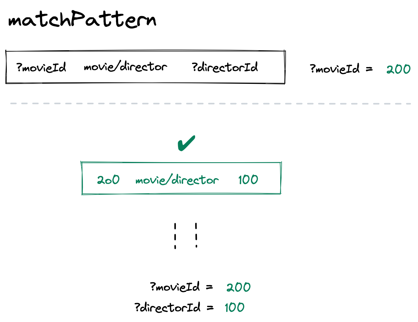 Here we tell the query engine to match three patterns. The first pattern produces a list of successful triples. For each successful triple, we search again with the second pattern, and so on. Notice how the ?movieId and ?directorId are repeated; this tells our query engine that for a successful match, those values would need to be the same across our different searches.